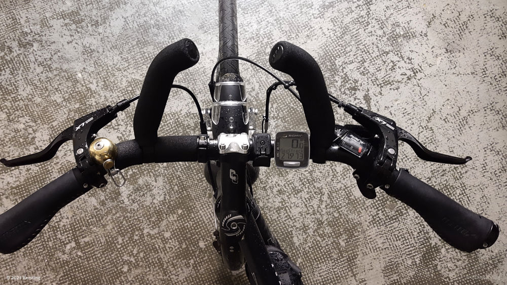 An meinem Pendlerrad habe ich statt eines schmaleren Lenkers „Inner-Barends“ montiert. Allein dadurch kann ich z.B. bei Gegenwind oder schneller Fahrt am Lenker bequem an die Lenkerhörnchen umgreifen. Eine schlaue Maßnahme ganz ohne unbequemen Rennlenker (samt kostspieliger Armaturen), die sehr viel Geschwindigkeit bringt. Der Körper wird flacher gestreckt und liegt dadurch tiefer, der cw-Wert sinkt dadurch erheblich. Die Stirnfläche in Rennposition beträgt ca. 0,38 m2 und benötigt bei 36 km/h 200 Watt. Bei aufrechter Fahrweise steigt die Stirnfläche am Rennrad schon auf 0,42 m2 und benötigt 280Watt. Das entspricht einer erforderlichen Mehrleistung von satten 40%, um die 36 km/h zu halten.[1] Wer es körperlich verträgt, kann auch den Lenker weiter nach unten stellen. Beim gängigen Ahead-Vorbau geschieht das durch simples Wegnehmen oder Austauschen von Distanzringen. Man benötigt dazu lediglich einen oder zwei Innensechskantschlüssel. Aber Vorsicht, hier machen 5 mm weniger doch schon viel aus im Kreuz und Nacken. Also in kleinen Schritten ausprobieren. Unnötig zu sagen, dass der Sattel möglichst hoch gestellt werden sollte. Sportliche Rennräder werden aus aerodynamischen Gründen oft mit einer Sattelüberhöhung gefahren, die aber eine gewisse körperliche Fitness voraussetzt.