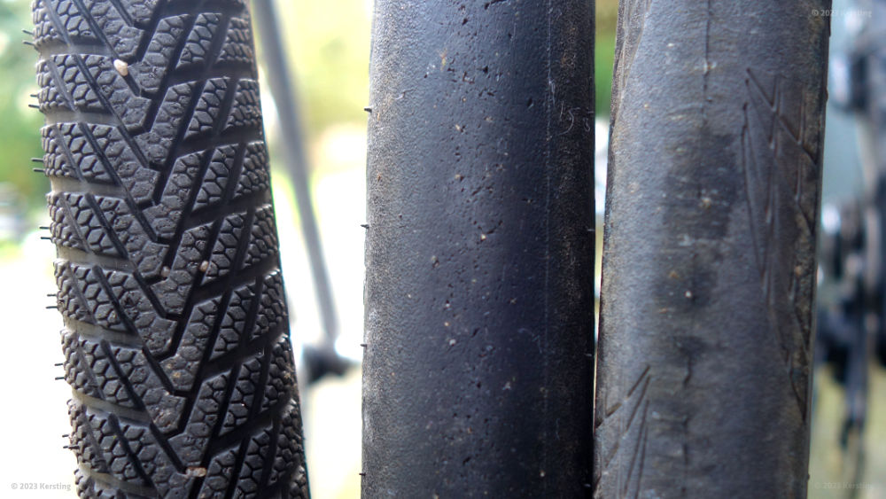 Der Wechsel auf schmalere und leichtere Straßenreifen hat mich z.B. auch am Motorrad überzeugt: Es läuft viel leichtfüßiger, muss nicht mit viel Kraft in die Kurven gedrückt werden und fährt mit einer Tankfüllung locker 10 bis 15% weiter, als mit dicken, schweren Walzen. Ich achte beim Fahrrad mittlerweile peinlich genau auf das Reifengewicht und behaupte mal ganz frech, dass schon ein Unterschied von nur 2 x 100 Gramm beim Beschleunigen an der Ampel spürbar sind, da es sich um große Rotationsmassen handelt. Das gilt natürlich auch für die Massenträgheit der Felgen, allerdings ist ein Austausch dieser beim Rad recht aufwendig und teuer. Hier ist es wahrscheinlich am besten, sich einen zweiten Radsatz besorgen, z.B. für Sommer und Winter… Winterreifen mit weicheren und groben Profilen bremsen leider auch am Fahrrad im Herbst schon heftig. Ich selbst nutze sie nur noch bei Schneefall über mehrere Tage.